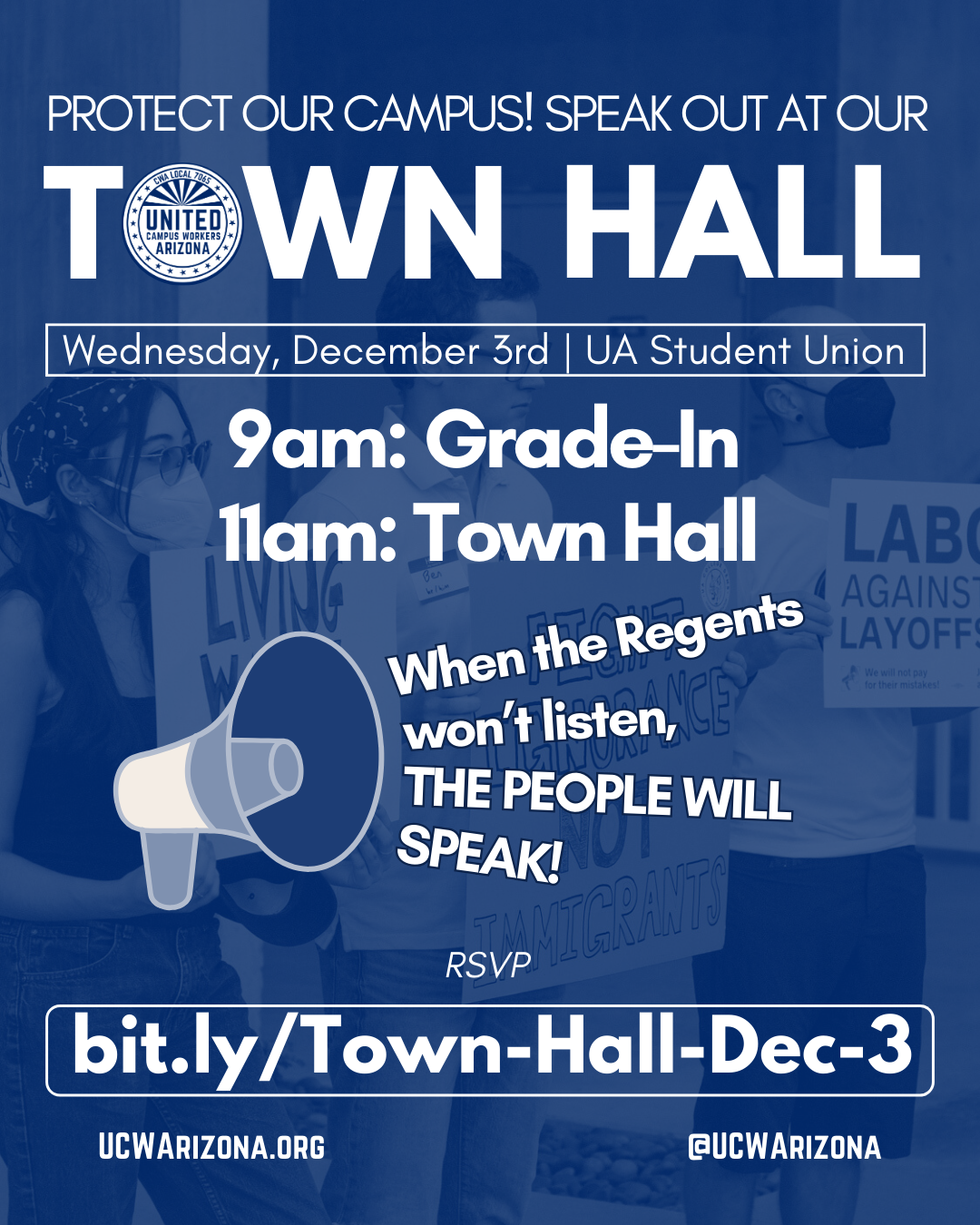 On Wednesday, December 3rd, our union United Campus Workers of Arizona CWA Local 7065 will host our own public comment in a Town Hall format. All are welcome to come and speak on pressing issues on campus. They won't listen to you - we WILL.